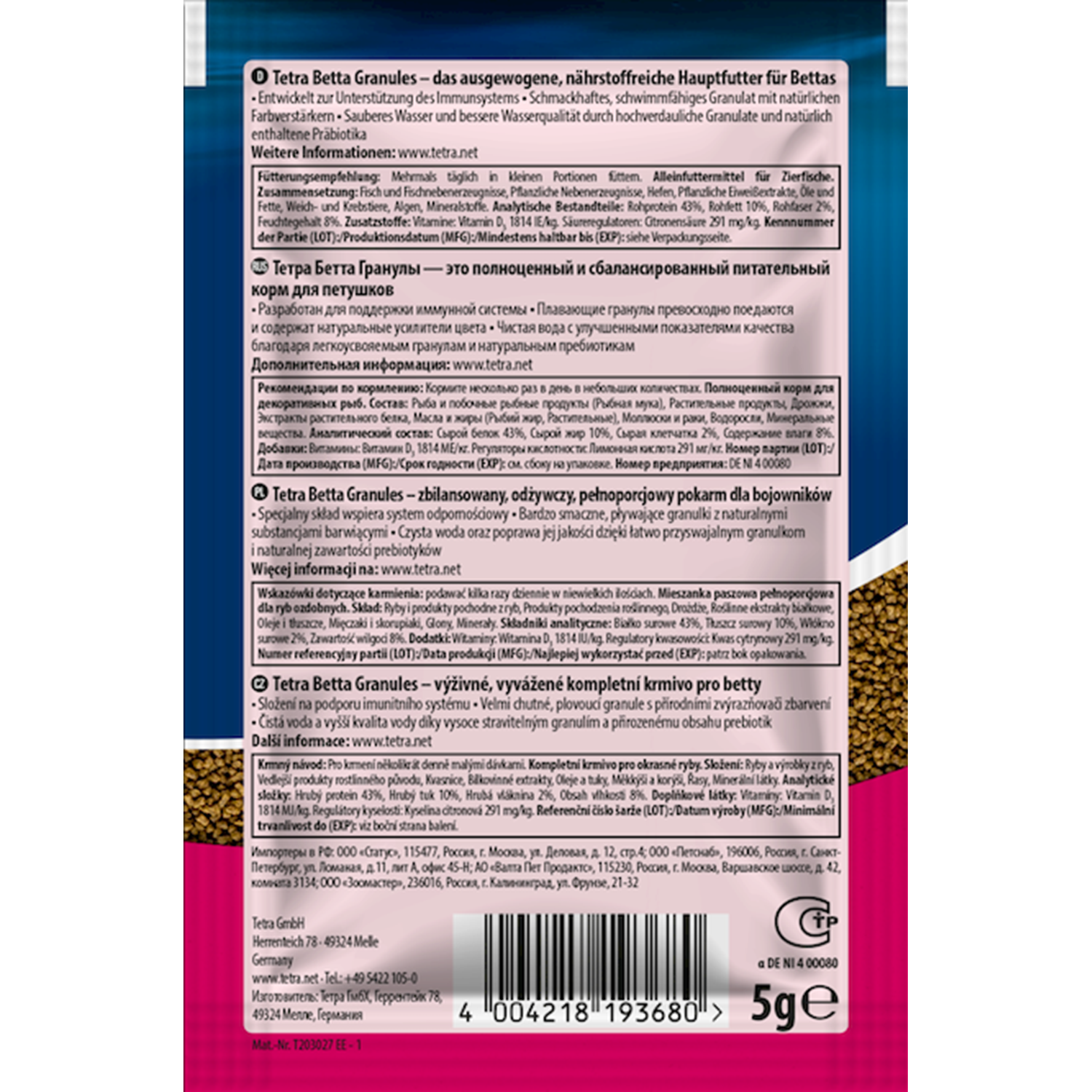 Tetra Betta Granules 5gr, betta balıklarının sağlıklı büyümesini, canlı renklerini ve güçlü bağışıklığını desteklerken akvaryum suyunun temiz kalmasına yardımcı olur.