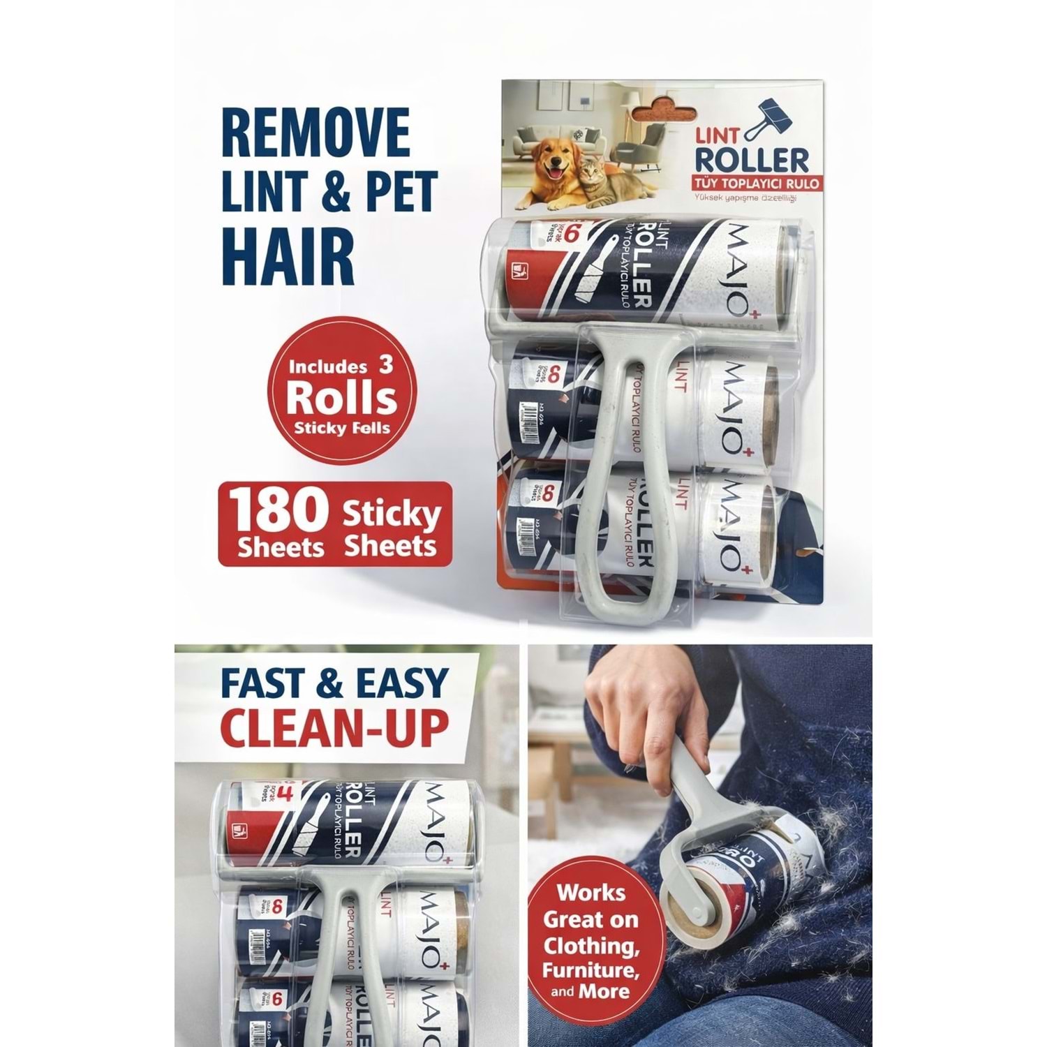 MAJO Tüy Toplama Rulosu, günlük yaşamda yüzeyleri ve kıyafetleri hızlı, pratik ve hijyenik şekilde temizlemenize yardımcı olan etkili bir temizlik çözümü sunar.