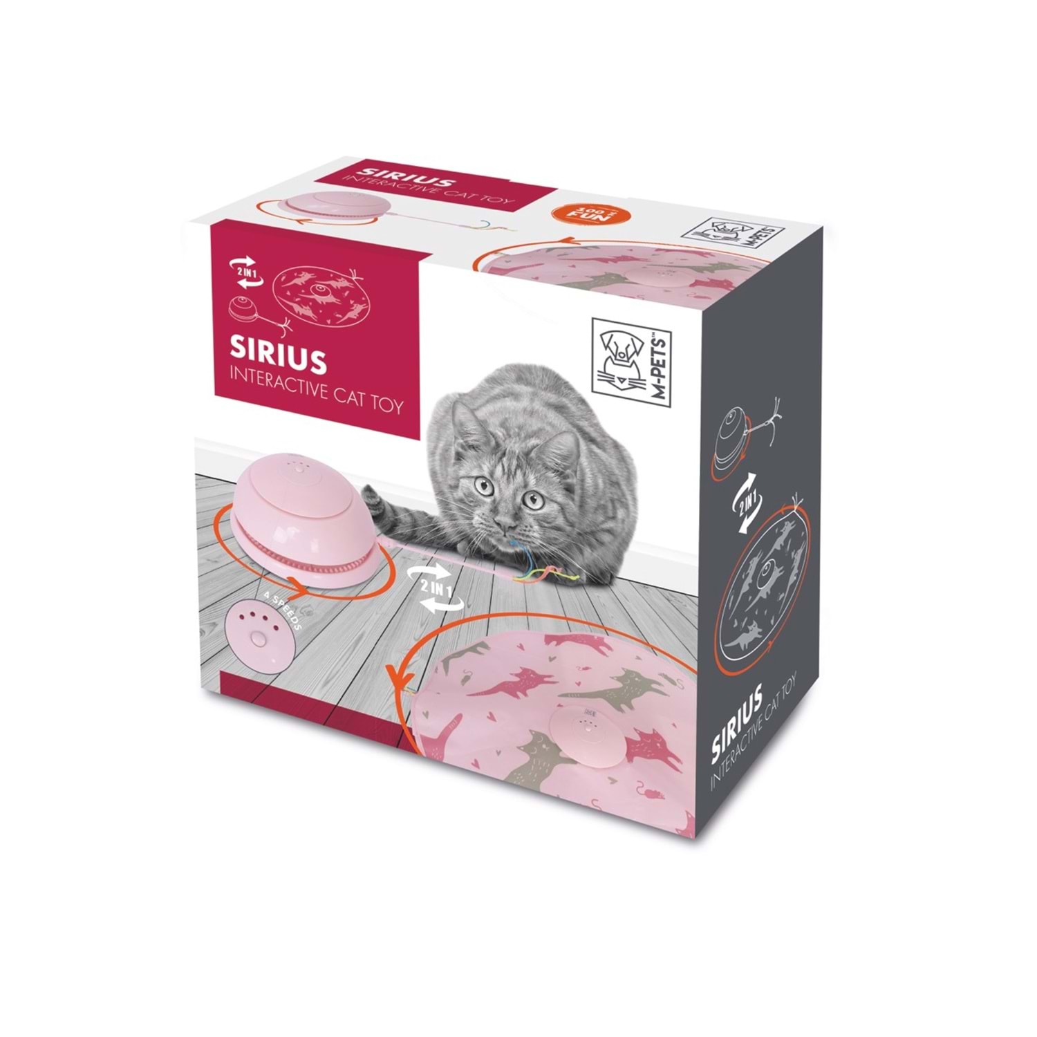 M-PETS Sirius Pembe, kedinizin doğasında var olan enerjiyi keyifli bir oyuna dönüştüren interaktif bir oyun arkadaşıdır.