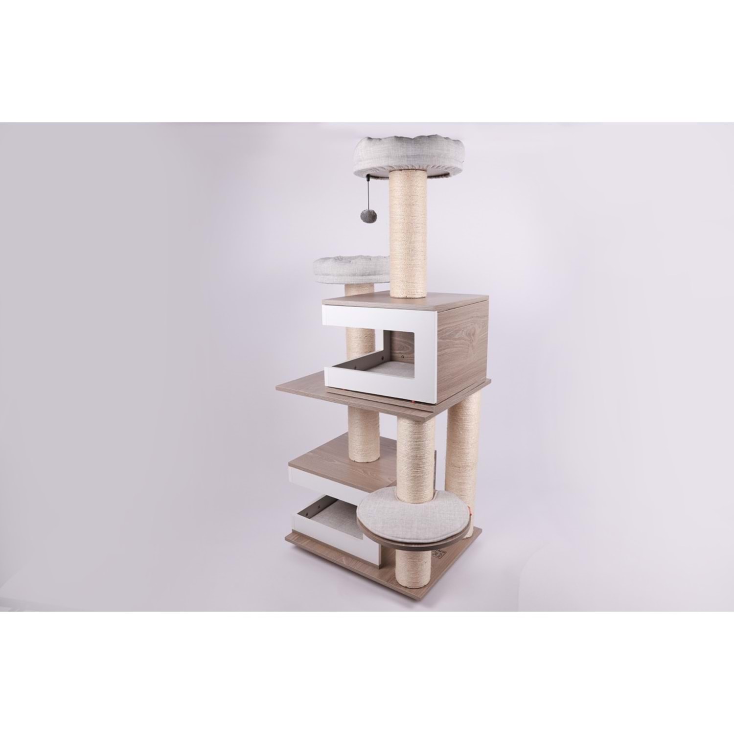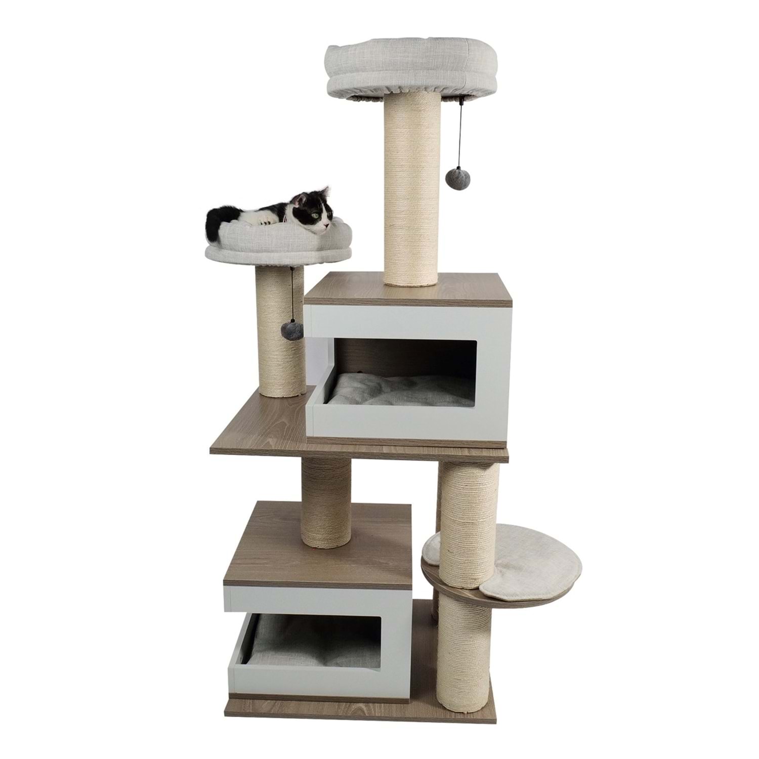 M-PETS CatElite Monica, zarif ve modern görünümüyle ev dekorasyonunuza kusursuz uyum sağlar. Modüler ve genişletilebilir tasarımı sayesinde kedinizin oyun, tırmalama ve dinlenme alanlarını kişiselleştirme imkânı sunar. FSC sertifikalı MDF malzeme ve dayanıklı sisal direklerle donatılmış bu özel tasarım, kedinizin ihtiyaçlarını karşılamak için tasarlandı. 5 adet yumuşak yastık içeren bu model, hem konfor hem de işlevsellik sunar.