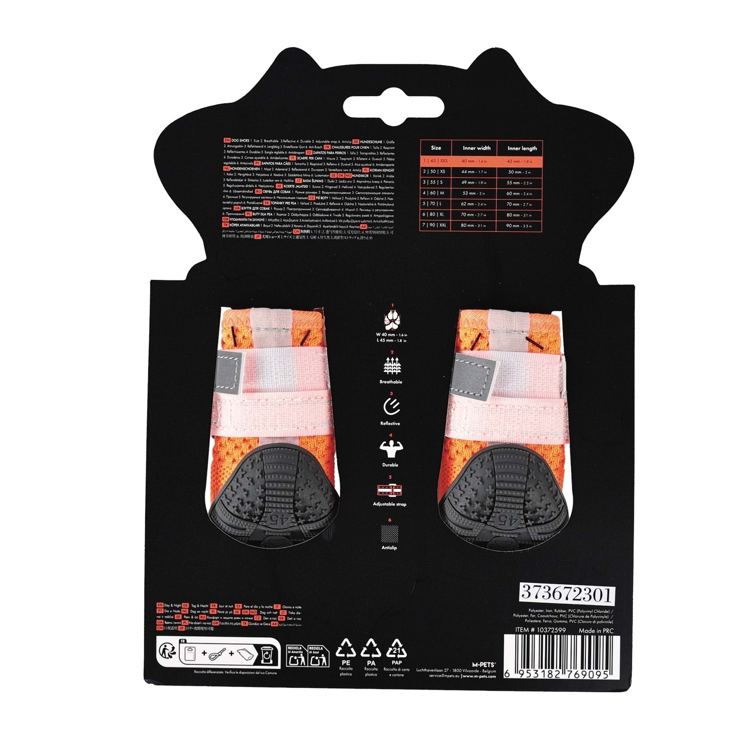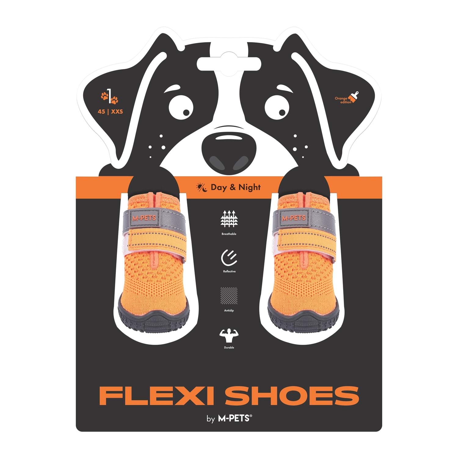 M-PETS FLEXI Köpekler İçin Ayakkabı, nefes alabilen yapısı, kaymaz tabanı ve ayarlanabilir kayış sistemiyle patilerin gün boyu korunmasına yardımcı olur. Day & Night konsepti sayesinde hem gündüz hem de düşük ışık koşullarında görünürlük sunar. Dayanıklı taban yapısı, ıslak ve kaygan zeminlerde güvenli tutuş sağlarken hafif ve esnek tasarımı patinin doğal hareketini destekler.