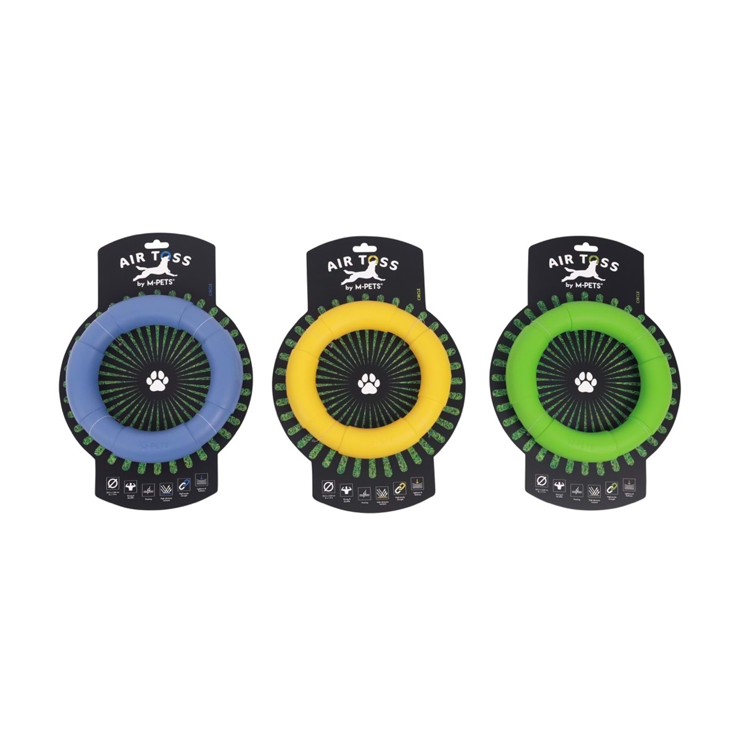 M-PETS® AIR TOSS Circle, iç ve dış mekanlarda fırlatma oyunları için özel olarak tasarlanmıştır. Süper hafif malzemesi sayesinde kolayca fırlatılabilir, su yüzeyinde batmadan yüzebilir. Sarı rengiyle dikkat çeken bu dayanıklı oyuncak, köpeğinizin hem fiziksel hem zihinsel enerjisini keyifle harcamasına yardımcı olur.