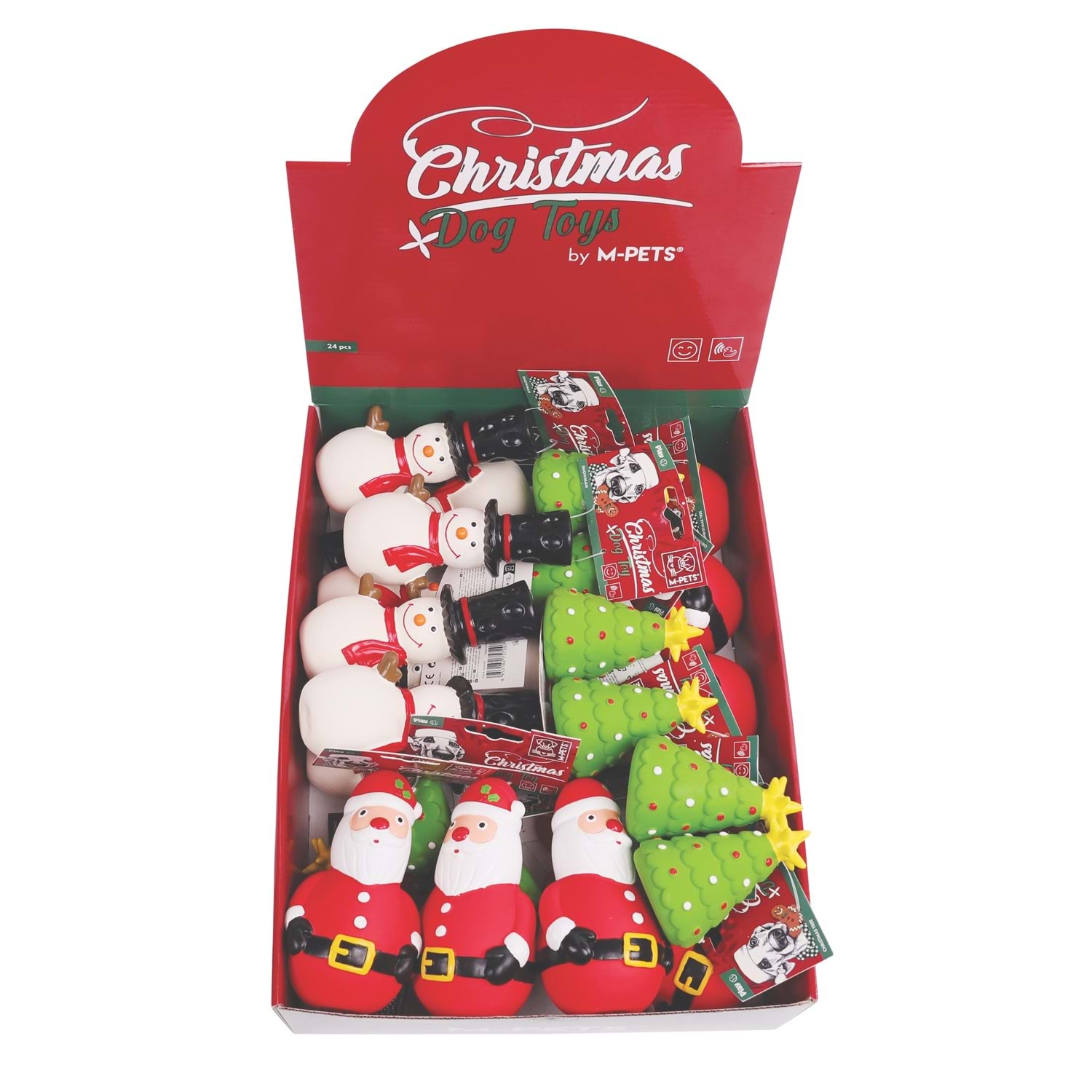 M-PETS Christmas Latex köpek oyuncağı mix 24’lü display set, yılbaşı döneminde raflarınıza renk, köpeklere ise güvenli ve eğlenceli bir oyun deneyimi sunar.